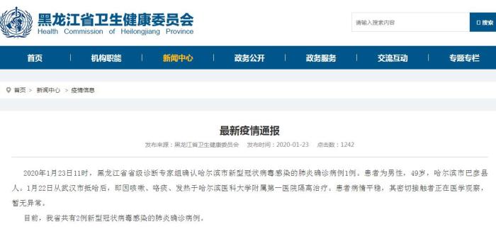 中新网1月23日电 据黑龙江省卫生健康委员会网站消息,2020年1月23日11时,黑龙江省省级诊断专家组确认哈尔滨市新型冠状病毒感染的肺炎确诊病例1例。患者为男性,49岁,哈尔滨市巴彦县人。1月22日从武汉市抵哈后,即因咳嗽、咯痰、发热于哈尔滨医科大学附属第一医院隔离治疗。患者病情平稳,其密切接触者正在医学观察,暂无异常。