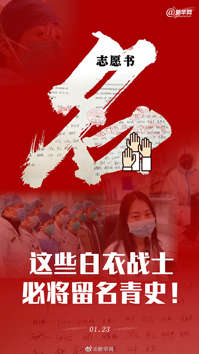 “我深知这场战役的艰巨性”“下一站天门南,我下车回武汉”“我报名”……新型冠状病毒肺炎疫情防控形势严峻,不断攀升的数字让人揪心、痛心。但这些天,全国各地那些医护人员的话,常常让我们热泪盈眶!1月23日,又见安徽百余名医护人员在志愿书上签名,请求去一线抗击新型肺炎。张慧、孙朋、刘平平、沈佳佳、方芳……一个个普通的名字,却让人肃然起敬!他们也是普通人,也是某个人的父母或孩子。但现在,他们是医生,是护士,是白衣战士!这场战役必将胜利,也请你们务必好好保护自己,平安归来。(赵刚/文 盛锐丽/图)