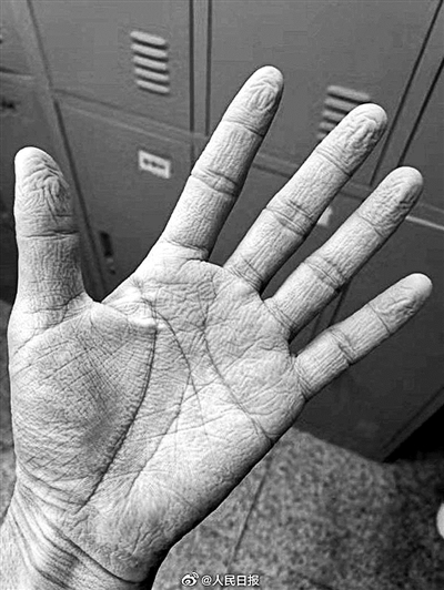在武汉新型冠状病毒感染的肺炎疫情出现后,王涛来到了抗疫一线。近日,王涛结束工作后,给妻子发去了一张照片。照片中,他的左手已经全都被泡皱。医院将照片发到网上后,有不少网友向一线医护人员表达了致敬。