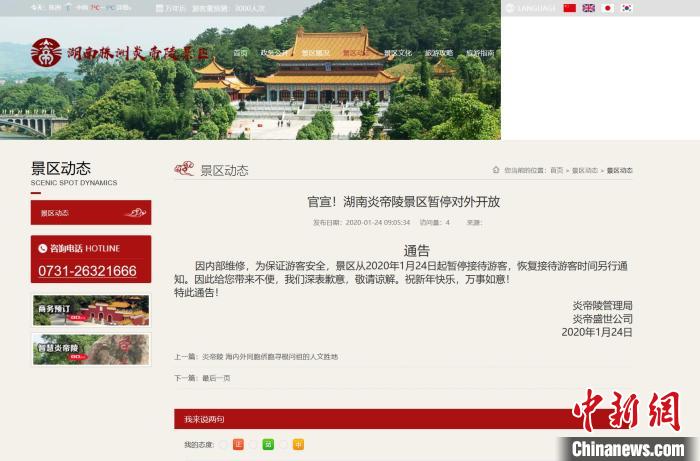 24日清晨,湖南株洲炎帝陵在网上《官宣!湖南炎帝陵景区暂停对外开放》,称“为保证游客安全,景区从2020年1月24日起暂停接待游客,恢复接待游客时间另行通知”。