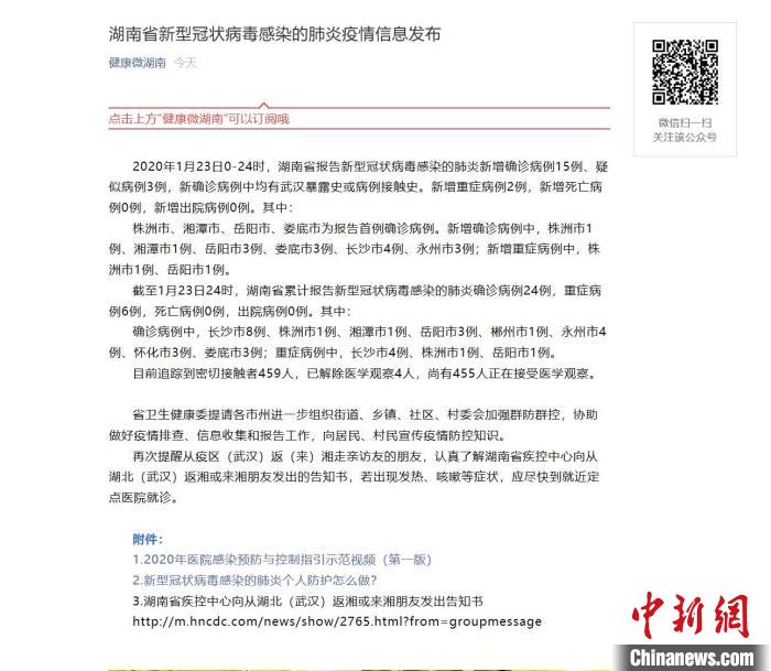 湖南省卫生健康委员会微信公众号发布的新型冠状病毒感染的肺炎疫情信息。 徐志雄 摄