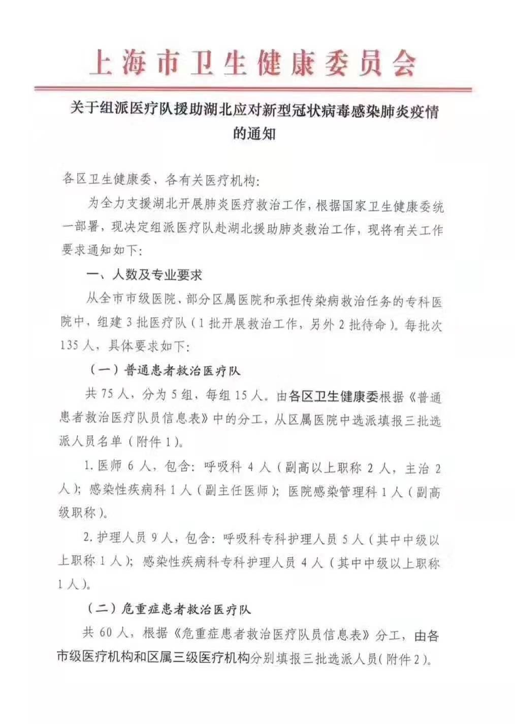 为支援湖北开展肺炎医疗救治工作,根据国家卫生健康委的部署,上海将从全市市级医院、部分区属医院和承担传染病防治任务的专科医院中组建3批医疗队。根据目前的工作方案,每批医疗队135人。