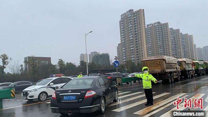 24日上午,在蔡甸区知音湖大道,蔡甸警方封闭半边车道,保障各类施工车辆顺利进场。