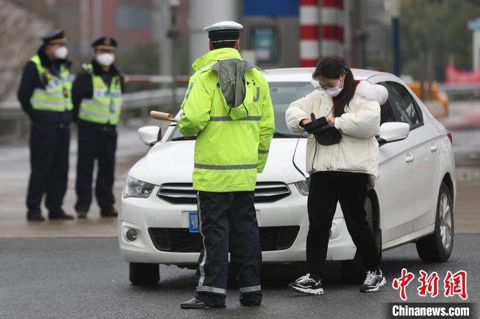 一辆鄂牌照小汽车刚刚进入上海市界就被交警拦了下来,进行防疫检查。 张亨伟 摄