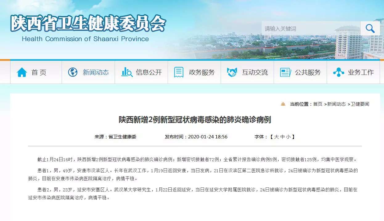 据陕西省卫生健康委通报,截至1月24日16时,陕西新增2例新型冠状病毒感染的肺炎确诊病例;新增密切接触者72例;全省累计报告确诊病例5例,密切接触者125例,均集中医学观察。