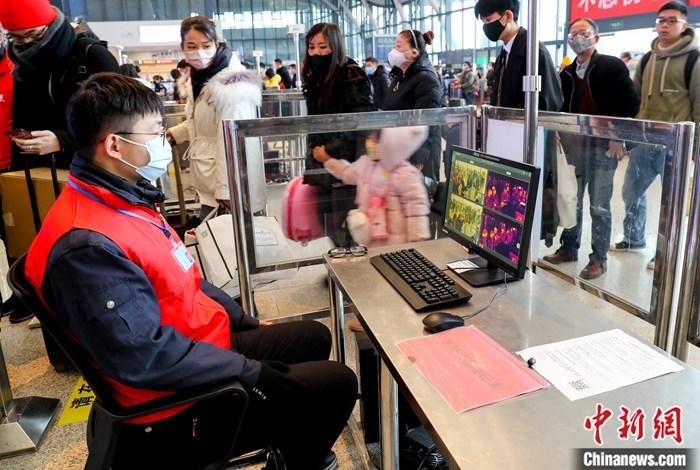 1月21日,武汉火车站进站大厅,红外体温检测仪检测进出旅客体温。中新社记者 张畅 摄