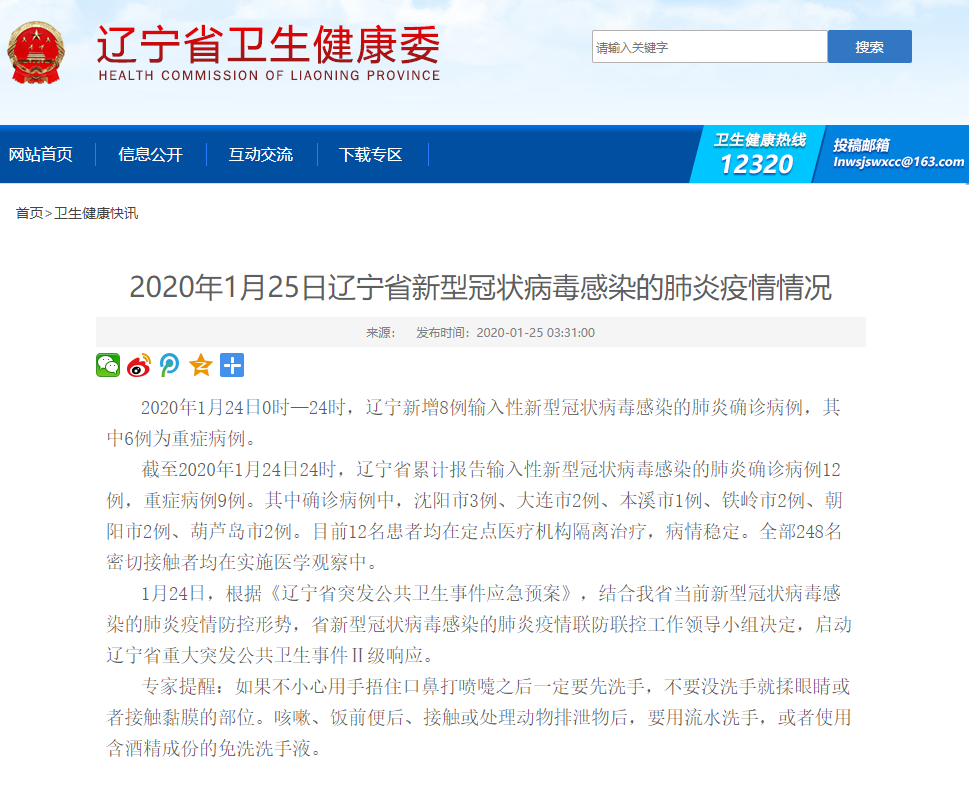 1月24日,根据《辽宁省突发公共卫生事件应急预案》,结合当前新型冠状病毒感染的肺炎疫情防控形势,辽宁省新型冠状病毒感染的肺炎疫情联防联控工作领导小组决定,启动辽宁省重大突发公共卫生事件Ⅱ级响应。