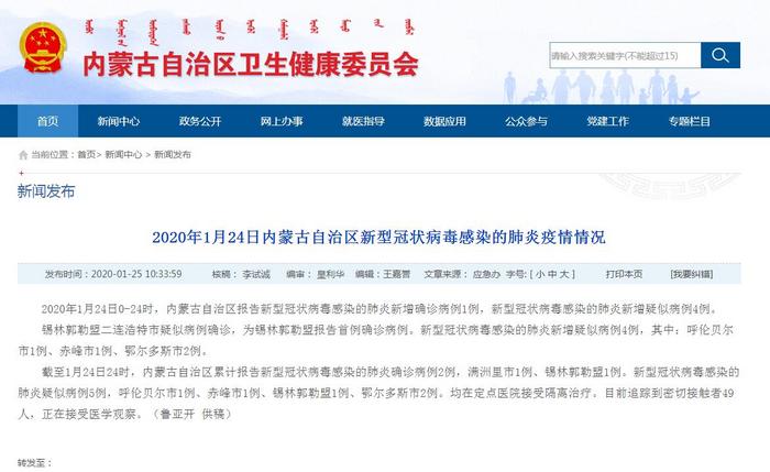 中新网呼和浩特1月25日电 (记者 张玮)25日,内蒙古自治区卫生健康委员会官方发布消息称,2020年1月24日0-24时,内蒙古自治区报告新型冠状病毒感染的肺炎新增确诊病例1例,共确诊2例。