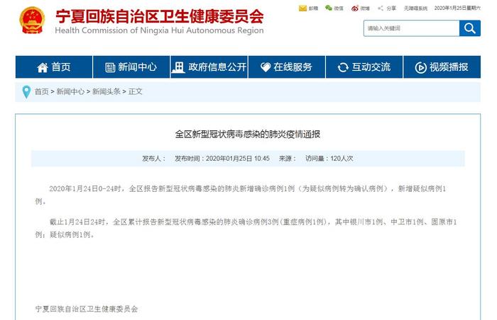 截至1月24日24时,宁夏累计报告新型冠状病毒感染的肺炎确诊病例3例(重症病例1例),其中银川市1例、中卫市1例、固原市1例;疑似病例1例。