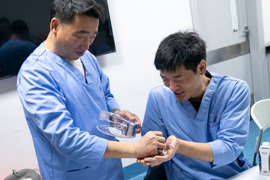 1月24日,武汉大学中南医院重症医学科的主任彭志勇(左)给同事陈少峰分发糖果,作为年夜饭的“加餐”。据悉,武汉地区医疗机构约8万名医务人员,春节期间都坚守岗位。新华社记者 熊琦 摄