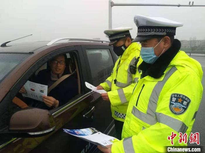 25日,襄阳民警在辖区高速公路出入口对车辆进行核查,宣传防疫知识 杨瑞 摄