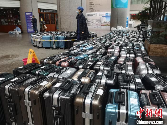 在浙江医疗队集合出征的浙江省人民医院,一箱箱支援物资正由工作人员接力搬运至卡车内。近百个行李箱内也齐整排列在大厅内,场面颇为壮观。箱内装满了为医疗队准备的医用口罩、检查手套、消毒水等物品。