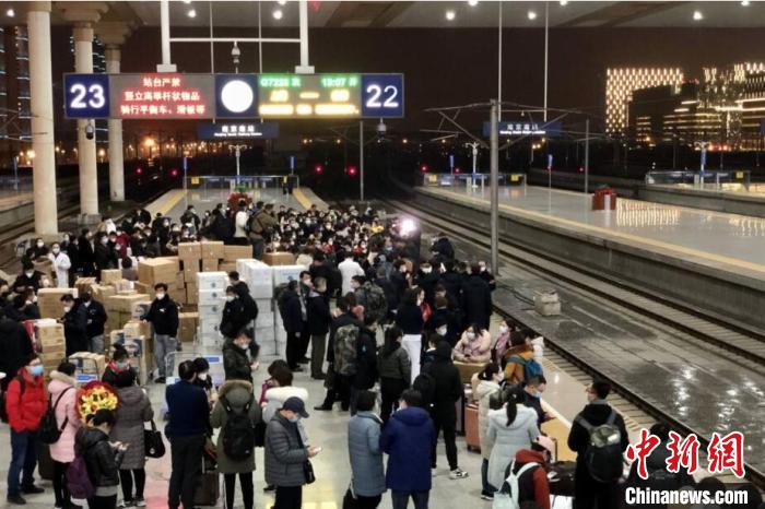 25日晚间,原本冷清南京南站月台上,呈现出异样的热闹,首批江苏援湖北医疗队的147名队员乘坐列车奔赴武汉。 申冉 摄