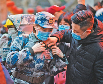 24日,空军军医大学医疗队受命紧急驰援武汉,这是前来送行的队员家属为队员整理背囊。