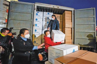 25日,工作人员在搬运医疗队带往武汉的医疗物资。当日,首批江苏援湖北医疗队从南京集结出发,奔赴武汉。