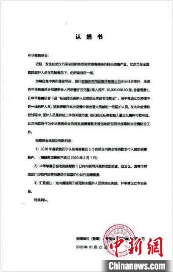 据悉,此次捐款也将作为中华慈善总会的首批捐赠善款,支援疫情防控工作。