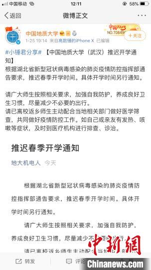 据不完全统计,截至26日上午,已有华中农业大学、中国地质大学(武汉)、长江大学、湖北工业大学、武汉纺织大学、武汉工程大学、三峡大学、武汉工商学院、湖北文理学院、武汉体育学院、武汉工程科技学院、武汉东湖学院、黄冈师范学院等10余所高校发布延迟开学通知。