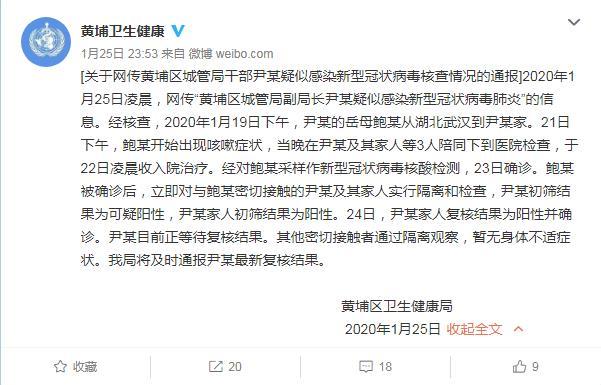中新网1月26日电 广州市黄埔区卫生健康局官方微博25日晚发布通报称,针对“黄埔区城管局副局长尹某疑似感染新型冠状病毒肺炎”的信息,对尹某及其家人等3人采样作新型冠状病毒核酸检测,尹某初筛结果为可疑阳性,家人复核结果为阳性并确诊。