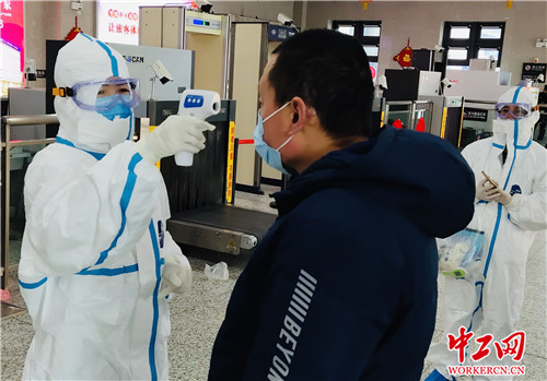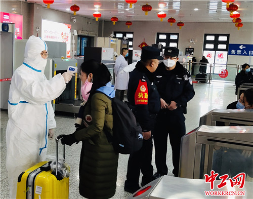 兰州局集团公司疾控所疾控业务技术人员在兰州站对进站旅客进行测温。