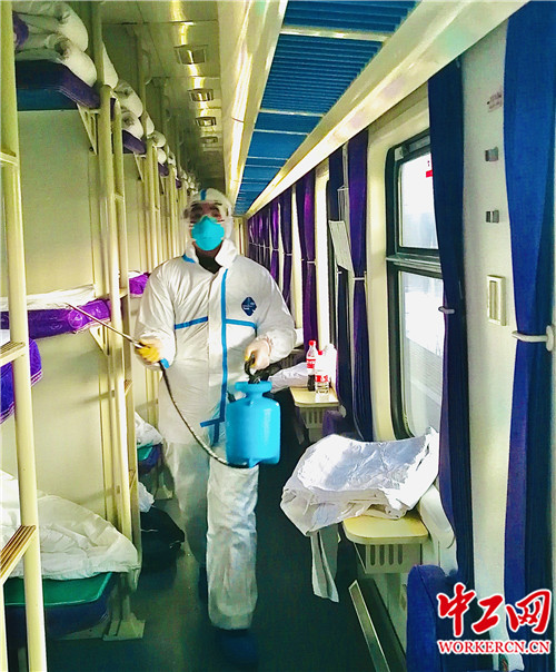 兰州局集团公司疾控所疾控业务技术人员在银川车站对武汉到达的列车进行终末消毒