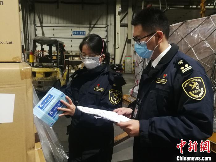 25日,从日本运送到中国国内的口罩抵达成都双流机场海关货运监管现场。 成都海关供图 摄