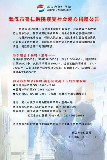 武汉普仁医院(原中国一冶职工医院)接受社会爱心捐赠公告