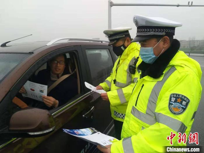 25日,襄阳民警在辖区高速公路出入口对车辆进行核查,宣传防疫知识。杨瑞 摄