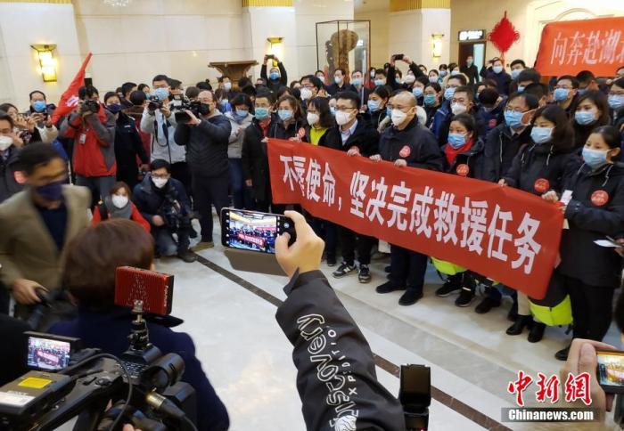 1月25日晚,山东首批医疗队138名医务人员奔赴武汉,支援湖北开展新型冠状病毒感染的肺炎医疗救治工作。中新社记者 张勇 摄