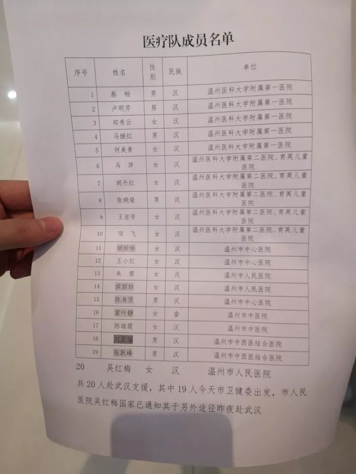 1月25日(大年初一),温州市20名医护人员出征,其中13名为女性。他们将紧急出发赶往武汉参与抗击新型冠状病毒肺炎。其中,温州市人民医院感管科主任吴红梅作为“国家专家组成员”已于25日凌晨先行出发。