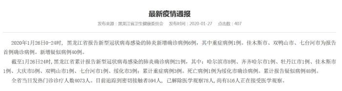 中新网1月27日电 据黑龙江省卫健委网站消息,2020年1月26日0-24时,黑龙江省报告新型冠状病毒感染的肺炎新增确诊病例6例,其中重症病例1例。佳木斯市、双鸭山市、七台河市为报告首例确诊病例。新增疑似病例40例。