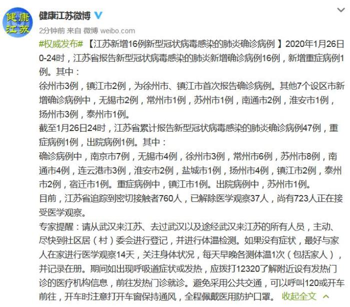 目前,江苏省追踪到密切接触者760人,已解除医学观察37人,尚有723人正在接受医学观察。