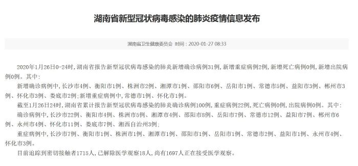 中新网1月27日电 据湖南省卫生健康委员会网站消息,2020年1月26日0-24时,湖南省报告新型冠状病毒感染的肺炎新增确诊病例31例,新增重症病例2例,新增死亡病例0例,新增出院病例0例。