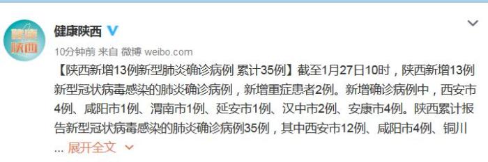 中新网1月27日电 据陕西省卫生健康委员会官方微博消息,截至1月27日10时,陕西新增13例新型冠状病毒感染的肺炎确诊病例,新增重症患者2例。新增确诊病例中,西安市4例、咸阳市1例、渭南市1例、延安市1例、汉中市2例、安康市4例。陕西累计报告新型冠状病毒感染的肺炎确诊病例35例,其中西安市12例、咸阳市4例、铜川市5例、渭南市1例、延安市2例、汉中市3例、安康市7例、商洛市1例。全省新增密切接触者286人,累计559人,均集中医学观察。