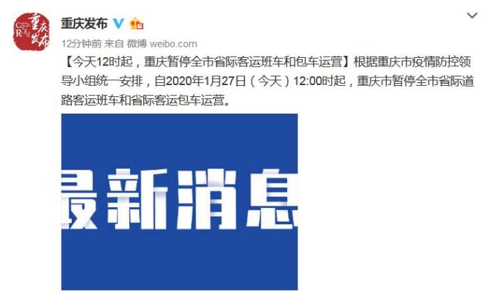 中新网1月27日电 据重庆市人民政府新闻办公室官方微博消息,根据重庆市疫情防控领导小组统一安排,自2020年1月27日(今天)12:00时起,重庆市暂停全市省际道路客运班车和省际客运包车运营。