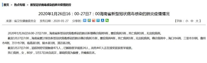 截至1月27日7:00,海南省累计报告新型冠状病毒感染的肺炎确诊病例31例,重症病例4例,死亡病例1例,无出院病例。确诊病例中,海口市6例、三亚市10例、儋州市4例、万宁市7例、临高县1例、陵水县1例、澄迈县2例。