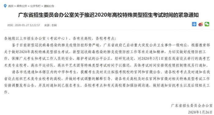 通知称,鉴于目前新型冠状病毒感染的肺炎疫情防控形势严峻,广东省政府已启动重大突发公共卫生事件一级响应,根据教育部关于做好2020年高校特殊类型招生考试、新型冠状病毒感染的肺炎疫情防控工作等有关通知精神,为切实做好疫情防控工作,保障广大考生和考试工作人员的安全,维护考试的公平公正,经研究决定,对2020年3月1日前在我省设点举行的高考艺术类专业校考、高水平运动队、高水平艺术团等特殊类型考试时间予以推迟,具体考试时间安排视疫情控制情况另行通知。