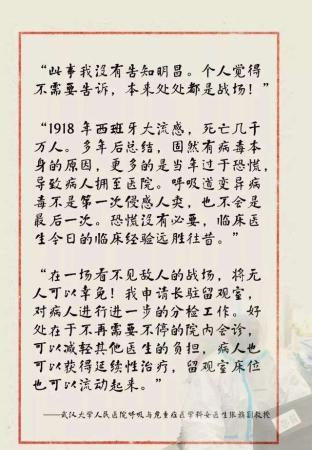 “此事我没有告知明昌。个人觉得不需要告诉,本来处处都是战场!”在一封抗击新型肺炎的请战书上,武汉大学人民医院呼吸与危重症医学科女医生张旃副教授书写下现代版“与夫书”。明知是战场,却义不容辞地请战;明知是战场,却义无反顾地与家“逆行”。这位医务人员将责任凌驾于爱情之上,用实际行动书写下了责任与担当。