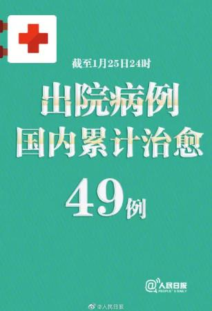 据国家卫健委26日通报,截至1月25日24时,累计治愈出院病例49例。