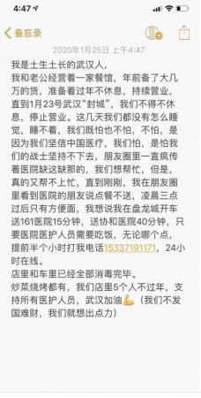25日,武汉一餐馆发帖:医护人员需要吃饭,提前半小时打电话,24小时在线,店、车已全消毒。