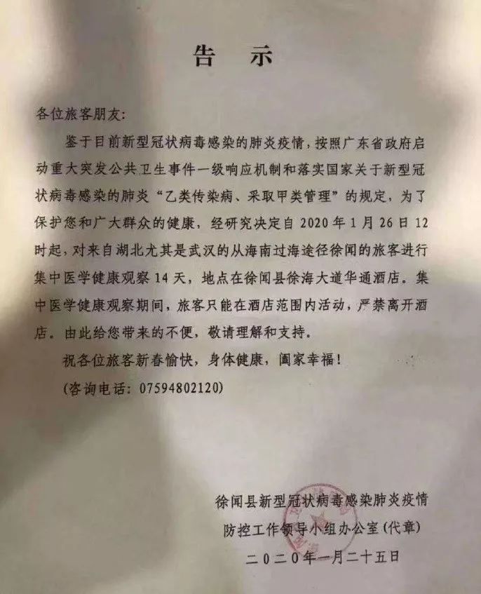 据了解,徐闻政府从1月25日开始安排了酒店提供给湖北籍旅客免费入住,并提供一日三餐和口罩。“观察期为14天。”