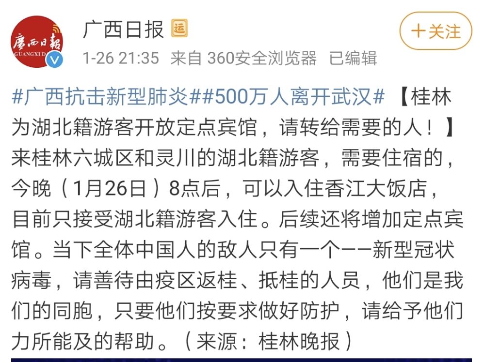 记者注意到,广西、云南、贵州等多地均发出相关通知,妥善处理滞留的湖北旅客。