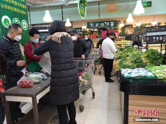 农历大年初二,武汉超市内各种新鲜蔬菜供应充足,市民戴口罩选购。中新社记者 丁喆 摄