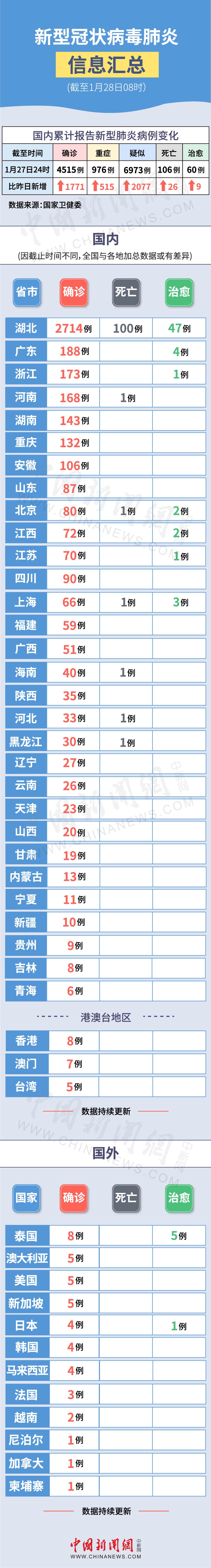 截至1月27日24时,国家卫生健康委收到30个省(区、市)累计报告确诊病例4515例,现有重症病例976例,累计死亡病例106例,累计治愈出院60例。现有疑似病例6973例。