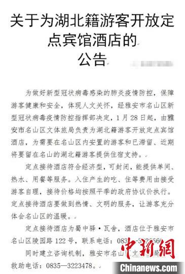 中新网名山1月28日电 (刘刚)“隔离病毒,不隔离爱!”记者28日从四川雅安市名山区新型冠状病毒疫情防控指挥部获悉,名山区已发出公告:从1月28日起,由雅安市名山区文体旅局负责为湖北籍游客开放定点宾馆和酒店,为需要在名山区内安置的游客和已滞留、近期将要留在名山的湖北籍游客提供食宿支持。