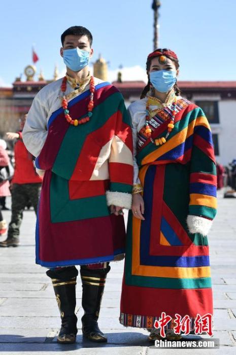 1月26日,大昭寺广场前拍摄结婚照片的一对新人戴上口罩。截至目前,新型冠状病毒感染的肺炎病例仍在上升,西藏自治区尚未发现疑似或确诊病例。面对疫情,拉萨民众齐心协力,全力预防新型冠状病毒。中新社发 钟欣 摄