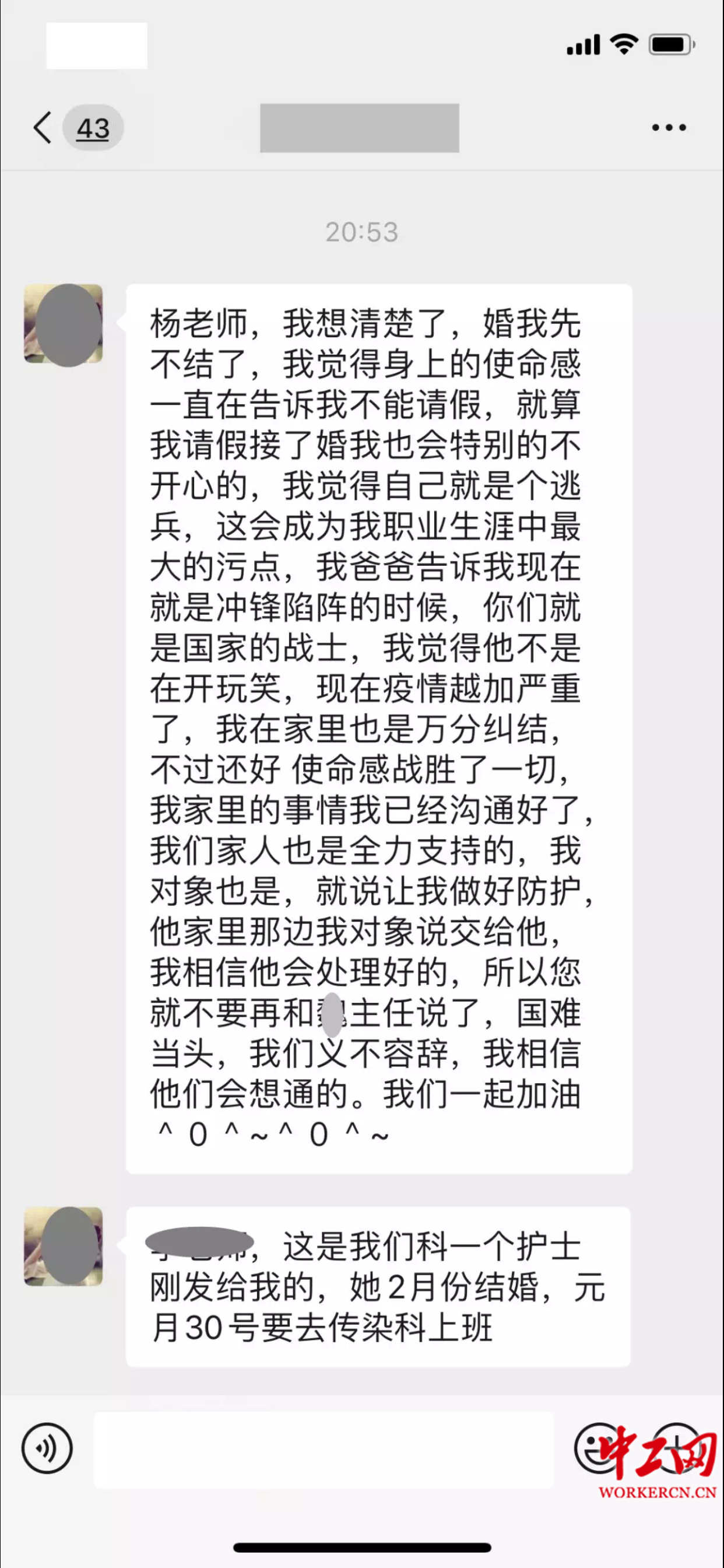 “我想清楚了,婚我先不结了,我觉得身上的使命感一直在告诉我不能请假!”大年初一上午,在甘肃省新型冠状病毒感染的肺炎定点医院——兰州大学第一医院,护士小黄向护士长发送了这样一条信息。25岁的护士小黄,原定今年2月春节结婚,在接到疫情防控部署后,决定推迟婚礼和婚假,主动请战,于1月30日至医院感染科上班,加入到防控救治一线医护队伍中去。