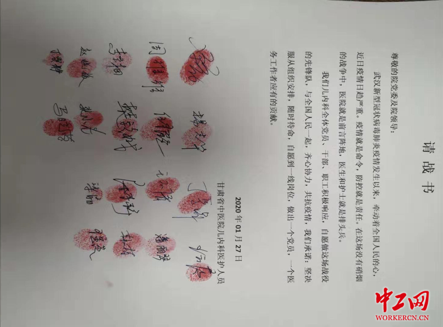 “选择穿上白大褂就等于选择了责任与使命,救死扶伤是我们的神圣职责,我们必须勇敢的投入到这场防控斗争中去。这是工作、更是责任,我们是医护工作者,抗击疫情责无旁贷 ! ”连日来,随着新型冠状病毒感染的肺炎疫情发生后,在甘肃省人民医院、省中医院、省第二人民医院、省妇幼保健院等医疗机构一份份“志愿书”“请战书”留下他们赤红的手印。