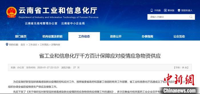 云南省工业和信息化厅官网消息,云南省内医用口罩等相关生产企业最迟全部于1月28日前复工复产。 云南省工业和信息化厅官网截图