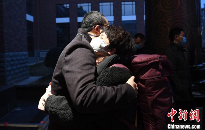 甘肃首支137人组成的抗疫医疗队在兰州整装集结驰援武汉,医疗队医护人员李永荣在出发前与丈夫告别。 杨艳敏 摄