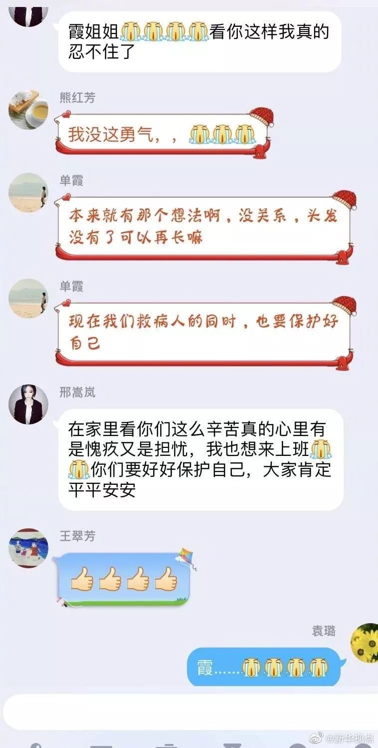 为了避免交叉感染,节约穿脱防护衣帽的时间,两个孩子的母亲、人民医院护士单霞毅然剪掉了自己的长发。“用我及腰长发,换你健康平安”。